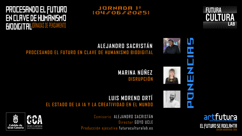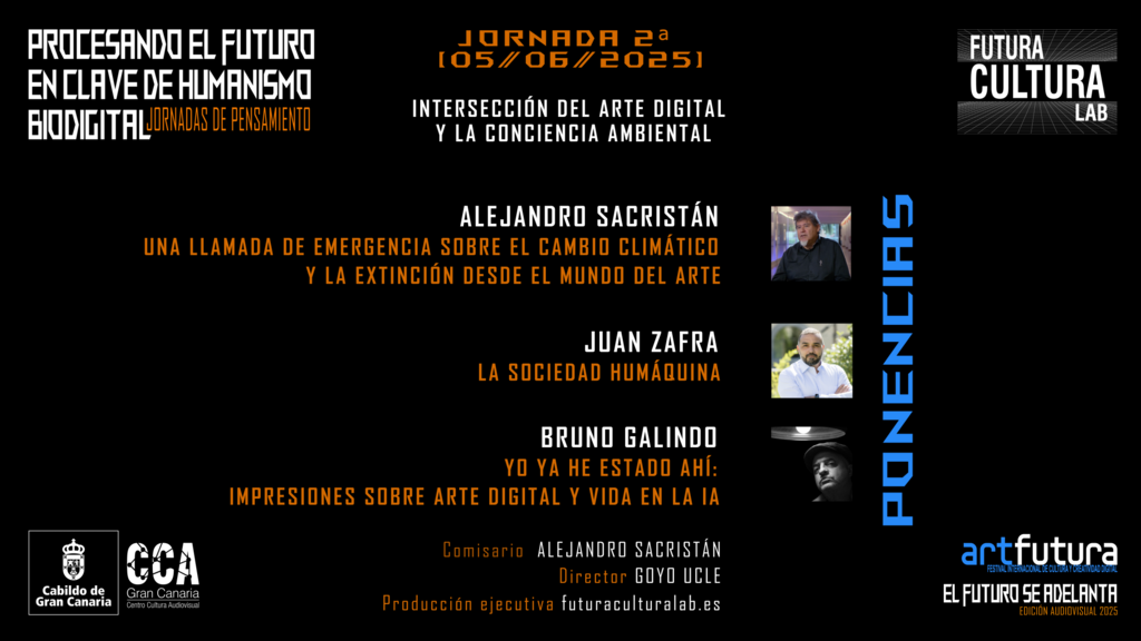 Dirección de Goyo Ucle y comisariado de Alejandro Sacristán, estas jornadas contarán con la participación de figuras clave como Juan Zafra, Marina Núñez, Luis Moreno Ortí, Marta Velázquez, Patricia Llaque Gálvez y Bruno Galindo, que reflexionarán sobre los avances y las implicaciones de la convergencia ACTS (Arte, Ciencia, Tecnología y Sociedad) en un equilibrio humano-máquina-naturaleza.